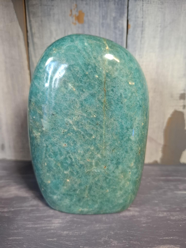 High quality, deep blue/green, Amazonite free-form, measuring approx 115mm x 78mm. A variety of Feldspar, it gets its name from the Amazon river, athough no deposits have ever been found in the Amazon. You will receive the exact crystal shown.