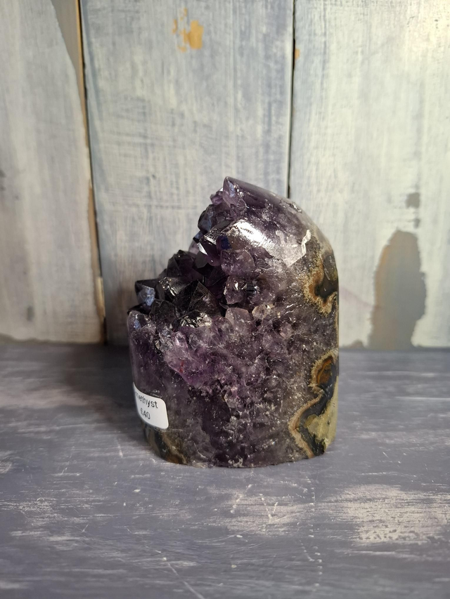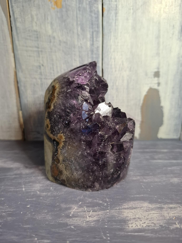 Dark purple Amethyst cut base cluster, measuring approx 82mm x 66mm x 58mm. Amethyst is a purple variety of Quartz and is found all over the world, most famously Brazil and Uruguay. The Greeks used it to protect against drunkeness and it has become known as the crystal to protect against drinking and addiction. You will receive the exact crystal shown.