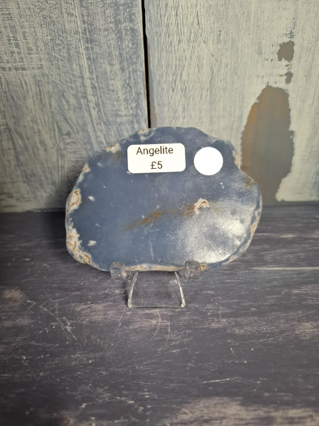 Angelite slice, measuring approx 70mm x 52mm. A soft blue variety of Anhydrite, and if it gets wet, it will turn back into Gypsum. You will receive the exact crystal shown.