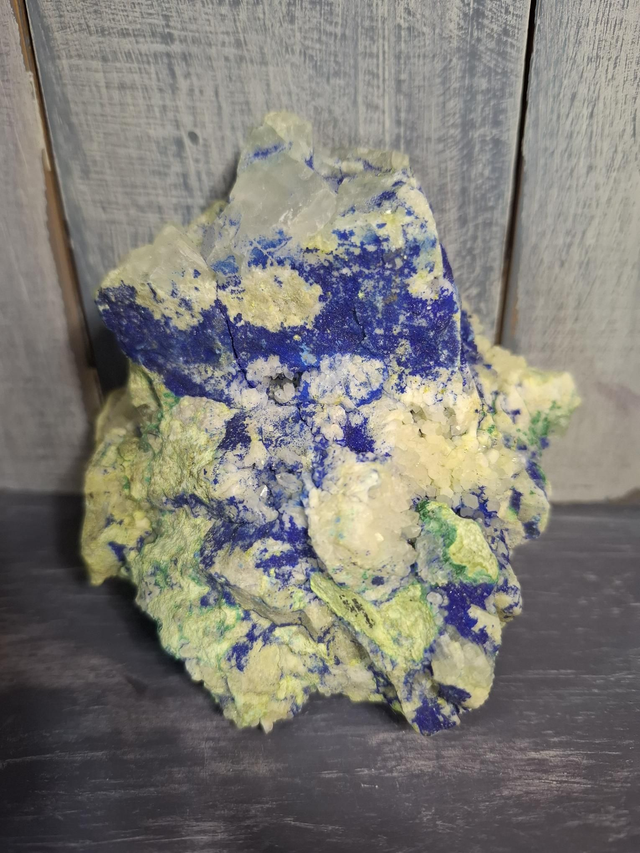 Deep blue pockets of sparkling Azurite with deep green Malachite and Clear Quartz, weighing approx 425g. Azurite is a soft, deep blue copper mineral and is named after the colour 'Azure'. It is often found alongside Malachite. You will receive the exact crystal shown.
