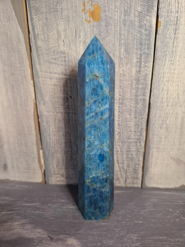 Blue Apatite tower, measuring approx 120mm x 21mm. Blue Apatite is the most popular of the Apatite colours, the others being yellow and green. The most striking blue colours are found in Madagascar. You will receive the exact crystal shown.