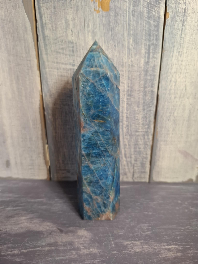 Blue Apatite tower, measuring approx 110mm x 30mm. Blue Apatite is the most popular of the Apatite colours, the others being yellow and green. The most striking blue colours are found in Madagascar. You will receive the exact crystal shown.