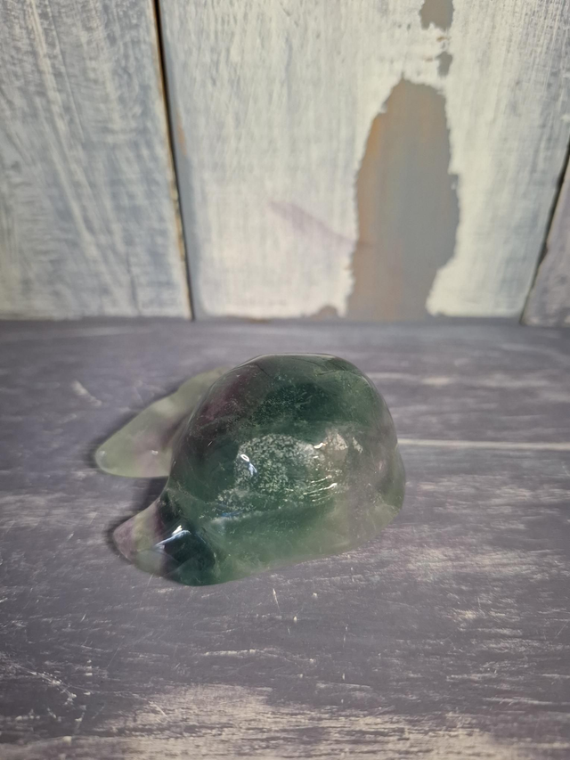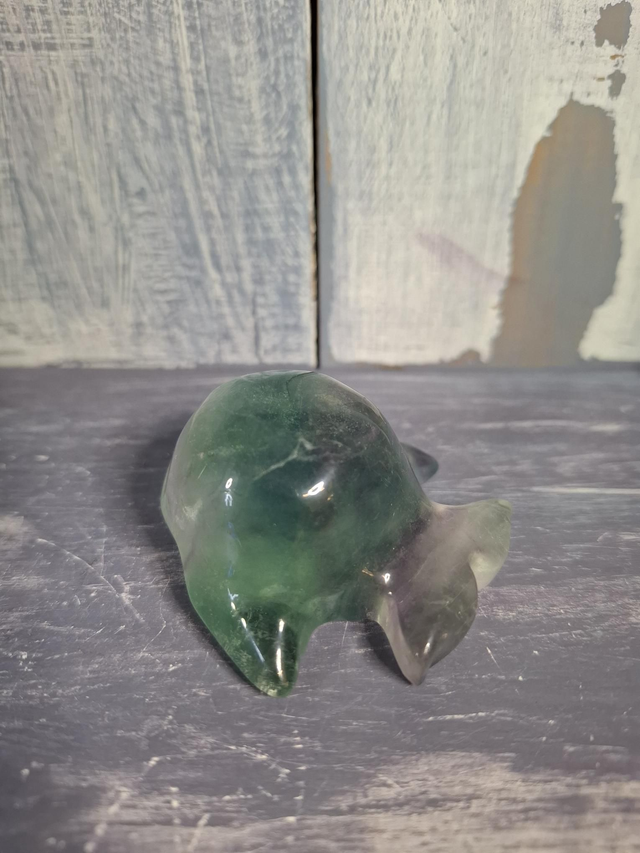 Blue Fluorite whale, measuring approx 53mm x 53mm x 30mm. Fluorite is found in a large variety of colours, due to the impurities in the crystal, and can be found in cubic form, octahedrons and large pieces without crystal structure visible to the naked eye. When Fluorite is pure it is colourless and many varieties are fluorescent. You will receive the exact crystal shown.