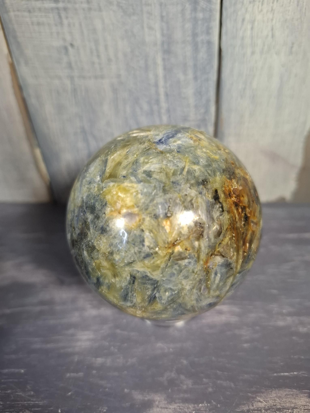 Blue Kyanite sphere, with Golden Healer, measuring approx 62mm. Blue is the most common colour but can also be found in black, green and orange. Forms in blades and can be quite brittle, so difficult to cut. You will receive the exact crystal shown.