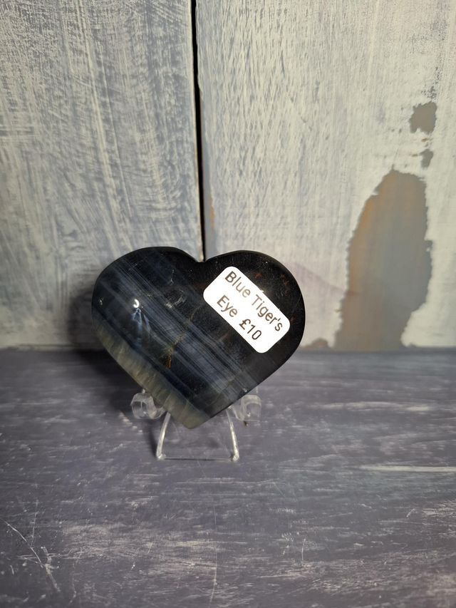 Blue Tiger's Eye heart, measuring approx 42mm x 49mm x 21mm. Also known as Falcon's Eye or Hawk's Eye and is the natural colour of Tiger's Eye. Left over time in the ground, it will eventually turn the golden colour we know as Gold Tiger's Eye. It has been prized by ancient civilisations for centuries. You will receive the exact crystal shown.