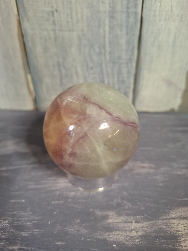 Soft coloured Candy Fluorite sphere, measuring approx 50mm. Fluorite is found in a large variety of colours, due to the impurities in the crystal, and can be found in cubic form, octahedrons and large pieces without crystal structure visible to the naked eye. When Fluorite is pure it is colourless and many varieties are fluorescent. You will receive the exact crystal shown.