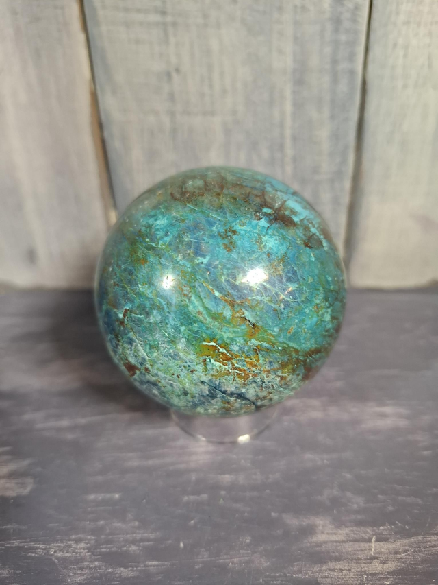 Chrysocolla sphere, measuring approx 60mm. A copper silicate often found alongside Malachite and Azurite. Most often the colour is green, blue or blue-green, though impurities can darken it to brown-black. Chrysocolla deposits have been found in Chile, Zaire, Russia and the USA. Prized by Native Americans as a powerful healing stone. You will receive the exact crystal shown.