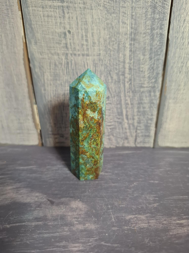 Chrysocolla tower, measuring approx 67mm x 20mm. A copper silicate often found alongside Malachite and Azurite. Most often the colour is green, blue or blue-green, though impurities can darken it to brown-black. Chrysocolla deposits have been found in Chile, Zaire, Russia and the USA. Prized by Native Americans as a powerful healing stone. You will receive the exact crystal shown.