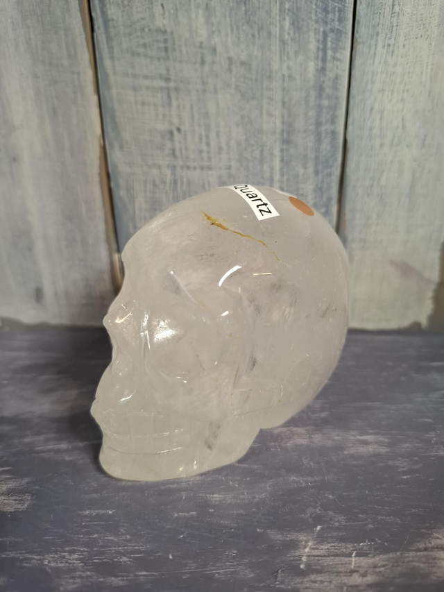 Clear Quartz skull, measuring approx 81mm x 52mm. One of the most widespread minerals in the world. Some Quartz crystals have the ability to generate electricity when hit, (piezoelectric). Used in many everyday things, such as clocks and electrical devices. You will receive the exact crystal shown.