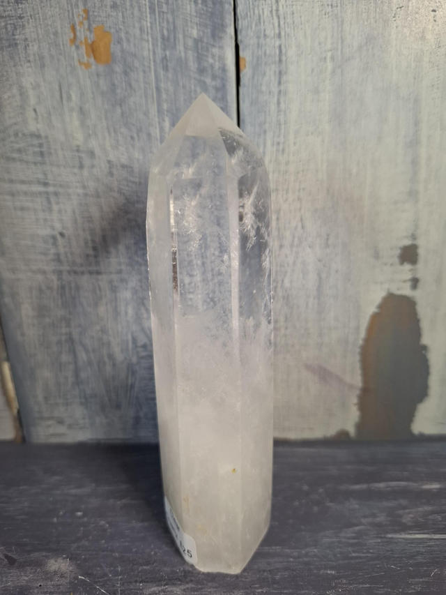 Clear Quartz tower, measuring approx 119mm x 36mm. One of the most widespread minerals in the world. Some Quartz crystals have the ability to generate electricity when hit, (piezoelectric). Used in many everyday things, such as clocks and electrical devices. You will receive the exact crystal shown.