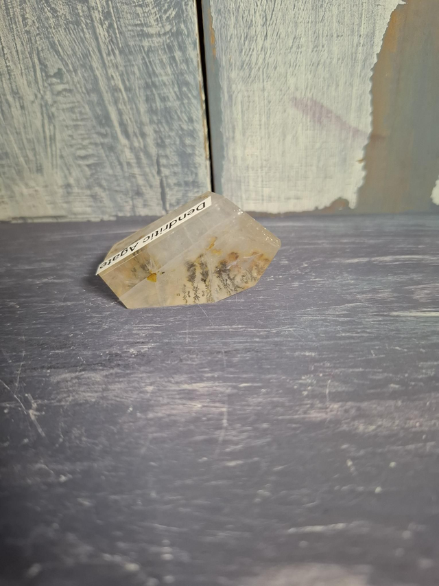 Dendritic Agate free-form, measuring approx 37mm x 20mm. A colourless, white or grey variety of Chalcendony (Quartz) characterized by distinct fern-like or tree-like inclusions called 'dendrites'. These patterns are formed by Iron or Manganese Oxides. You will receive the exact crystal shown.