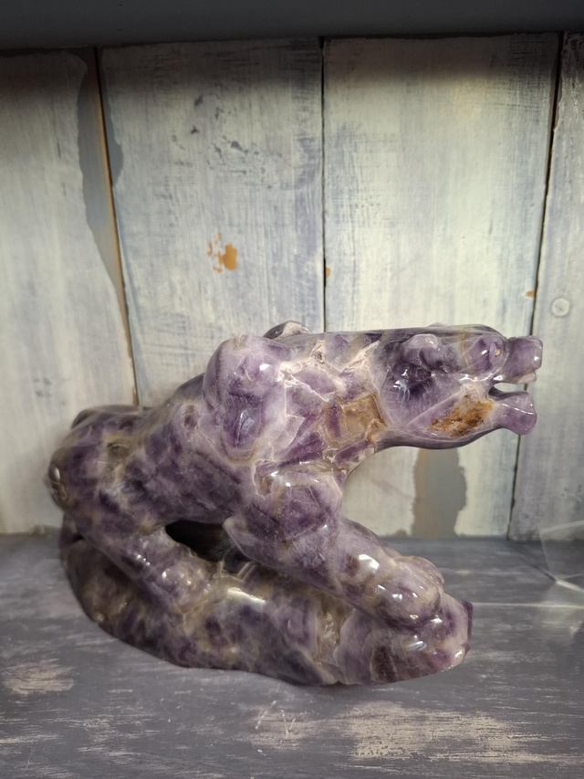 Dream Amethyst tiger carving, measuring approx 226mm x 123mm x 53mm. Chevrons or zigzag patterns of white Quartz within purple Amethyst. Amethyst is a purple variety of Quartz and is found all over the world, most famously Brazil and Uruguay. The Greeks used it to protect against drunkeness and it has become known as the crystal to protect against drinking and addiction. You will receive the exact crystal shown.