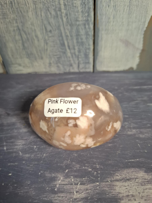 Chunky pink Flower Agate palmstone with a sparkly druzy, measuring approx 58mm x 39mm x 33mm. A farily new discovery from Madagascar. Pale coloured Agate with soft, white plumes resembling flowers. You will receive the exact crystal shown.