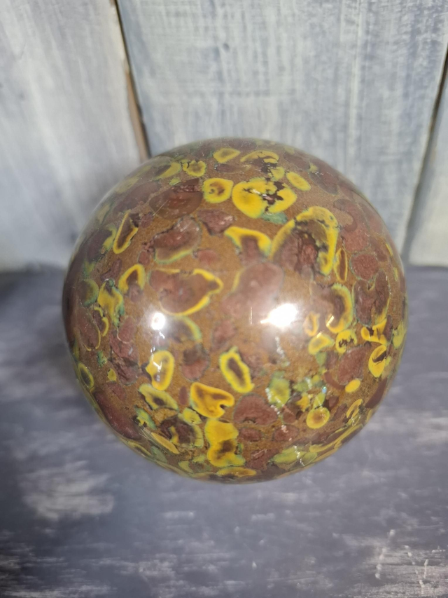 Fruit Jasper sphere, measuring approx 72mm. Also known as Ajooba Jasper, it is a multi coloured stone from India, particularly Madhya Pradesh. It has an appearance that resembles fruit cake, with its brecciated inclusions of red, green, yellow and brown Jasper within a tan or beige matrix. Jasper is an opaque variety of Quartz and comes in a large variety of patterns and colours. You will receive the exact crystal shown.