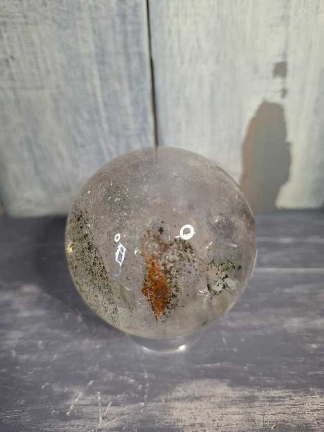 Garden Quartz sphere with red and green inclusions, plus rainbow, measuring approx 58mm. Inclusions within Clear Quartz which gives the effect of a landscape, garden or underwater scene. You will receive the exact crystal shown.
