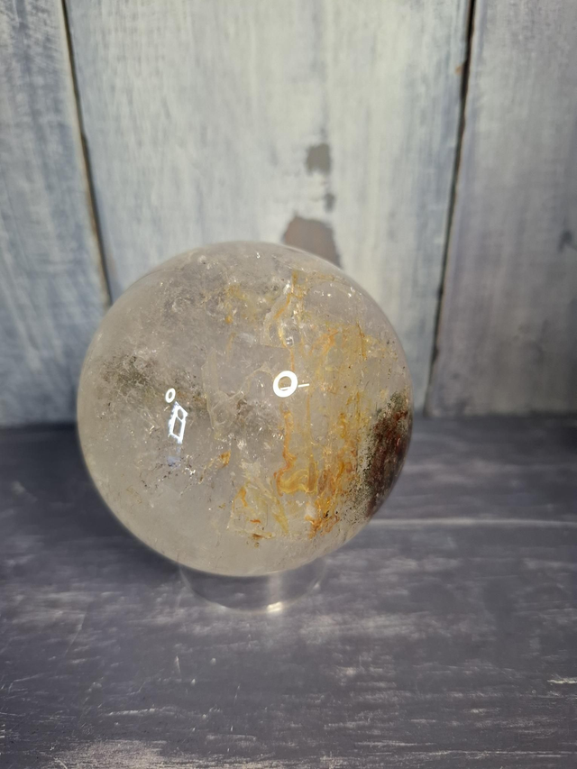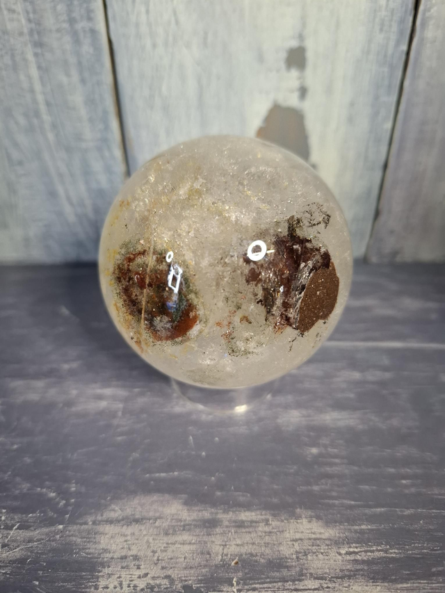 Garden Quartz sphere with red and green inclusions, plus Golden Healer, measuring approx 60mm. Inclusions within Clear Quartz which gives the effect of a landscape, garden or underwater scene. You will receive the exact crystal shown.