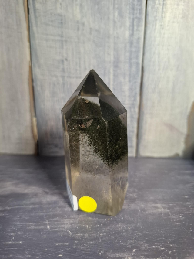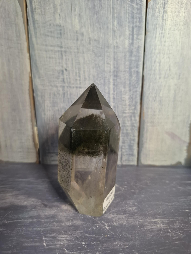 Garden Quartz tower, with dark green inclusions forming a 'mountain', measuring approx 75mm x 37mm. Inclusions within Clear Quartz which gives the effect of a landscape, garden or underwater scene. You will receive the exact crystal shown.