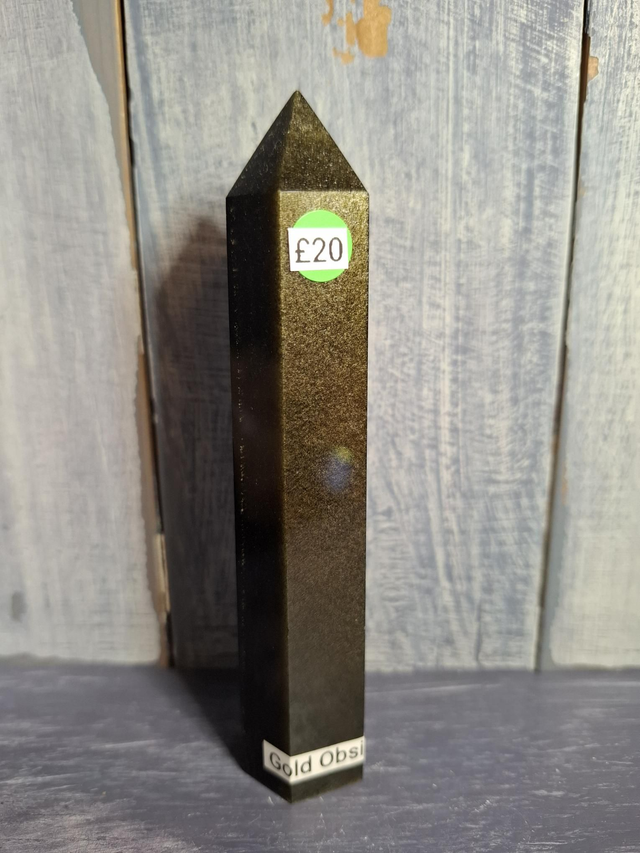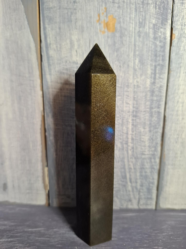 Gold Sheen Obsidian tower, measuring approx 120mm. Gold Sheen Obsidian is a naturally occurring volcanic glass with a beautiful gold shimmer caused by internal gas bubbles and inclusions. Obsidian is a natural volcanic glass formed after eruptions and comes in different varieties, with plain black being the most common.The use of Obsidian dates back to the Stone Age. It has been polished into mirrors for use in contacting Spirit and forged into weapons and tools. It has such a sharp edge that even today, surgical scalpels are made from it. You will receive the exact crystal shown.