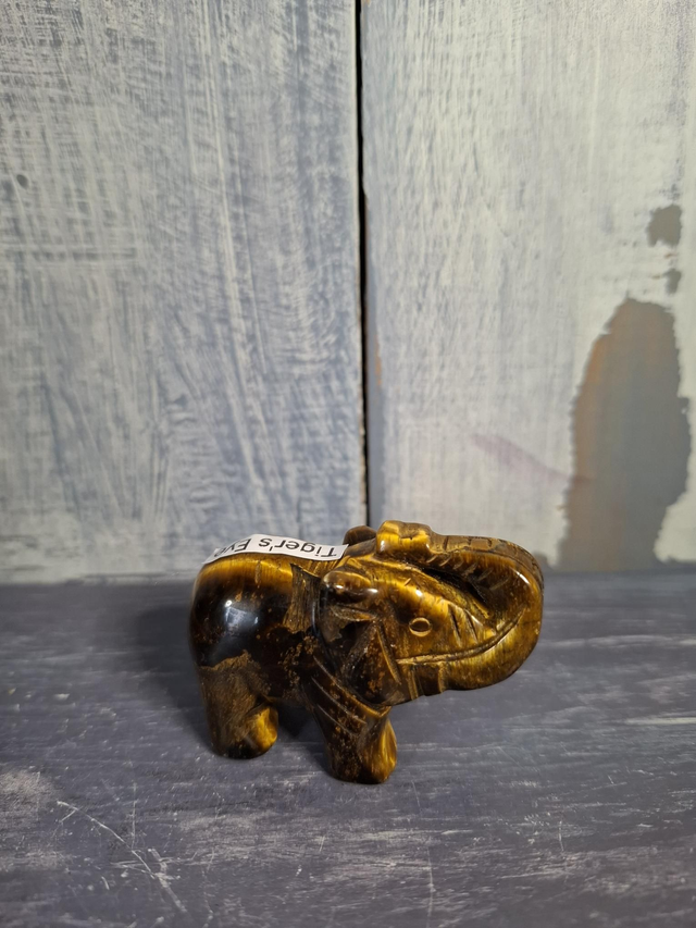 Gold Tiger's Eye elephant, measuring approx 51mm x 36mm. A black and gold crystal with a chatoyant (shimmer) effect, which comes from asbestos that has been replaced by Quartz over the crystals lifetime. It has been prized by ancient civilisations for centuries. You will receive the exact crystal shown.