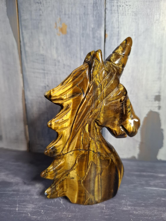 Gold Tiger's Eye unicorn head, measuring approx 120mm x 65mm. A black and gold crystal with a chatoyant (shimmer) effect, which comes from asbestos that has been replaced by Quartz over the crystals lifetime. It has been prized by ancient civilisations for centuries. You will receive the exact crystal shown.
