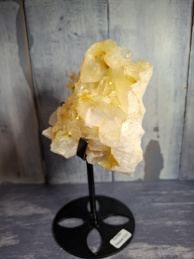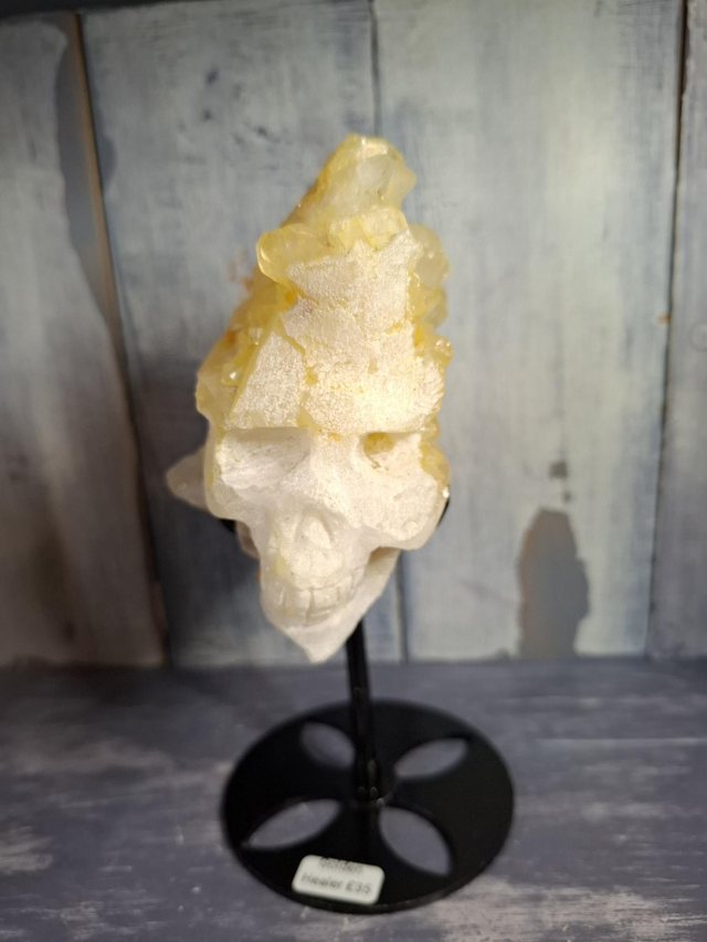 Golden Healer druzy skull with stand, measuring approx 83mm x 86mm. The matrix forms the skull with Quartz crystals protruding from the head. Clear Quartz, with inclusions of Iron that gives it its golden colouring. Good quality Golden Healer can be found in Brazil and Madagascar. You will receive the exact crystal shown.