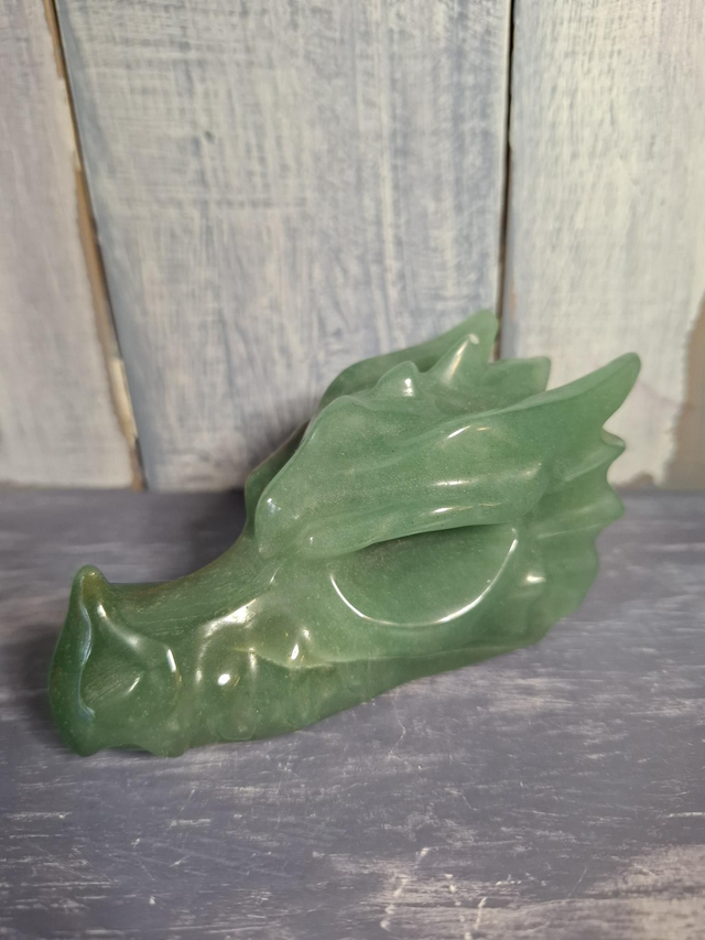 Green Aventurine dragon head, measuring approx 95mm x 45mm. A form of Quartz with sparkly inclusions of Fuchsite. You will receive the exact crystal shown.