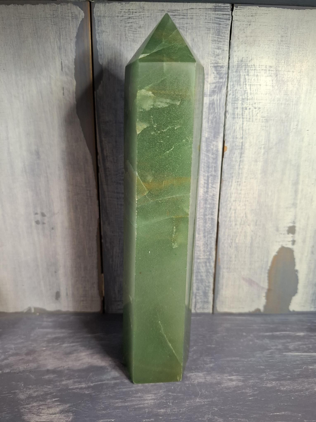 Green Aventurine tower, measuring approx 195mm x 45mm. A form of Quartz with sparkly inclusions of Fuchsite. You will receive the exact crystal shown.