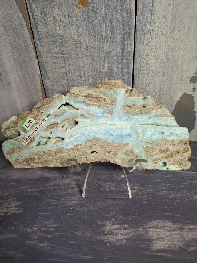 Hemimorphite slice, measuring approx 150mm x 70mm. Found in varying shades of blue, green and white, Hemimorphite is an ore of Zinc, and has been found in a number of locations around the world. You will receive the exact crystal shown.