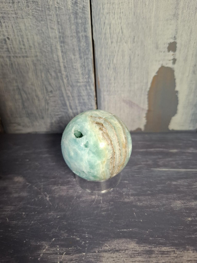 Hemimorphite sphere, measuring approx 43mm. Found in varying shades of blue, green and white, Hemimorphite is an ore of Zinc, and has been found in a number of locations around the world. You will receive the exact crystal shown.