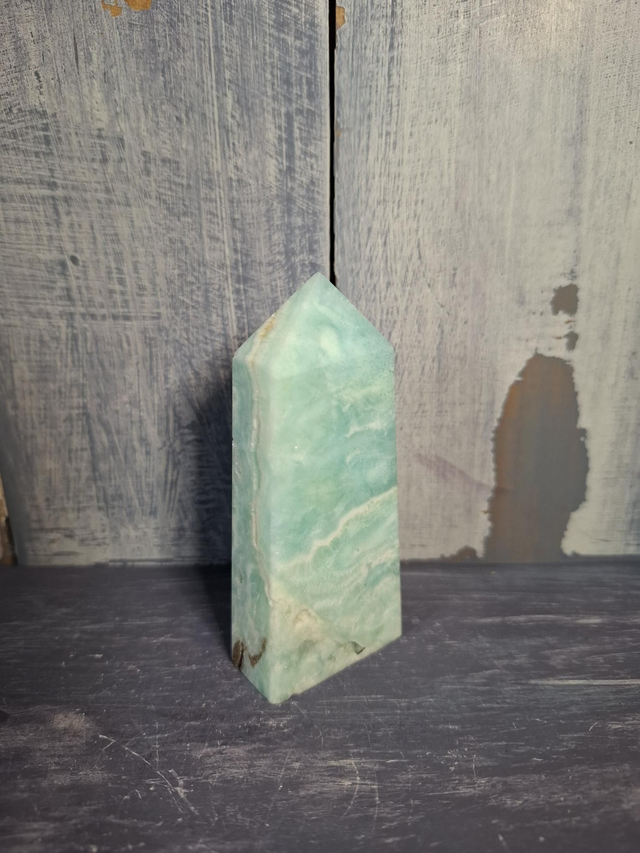 Hemimorphite tower, measuring approx 83mm x 35mm x 18mm. Found in varying shades of blue, green and white, Hemimorphite is an ore of Zinc, and has been found in a number of locations around the world. You will receive the exact crystal shown.