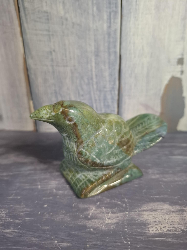 A light green Jasper bird carving, measuring approx 96mm x 37mm x 58mm. Jasper is an opaque variety of Quartz and comes in a large variety of patterns and colours, from simple Red and Yellow Jasper, to patterned Jaspers like Picasso and Picture Jasper. Rarer Jaspers such as Ocean Jasper and Orbicular Jasper can only be found in small, select locations. You will receive the exact crystal shown.