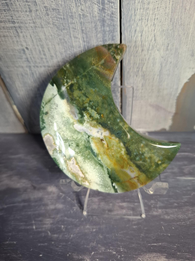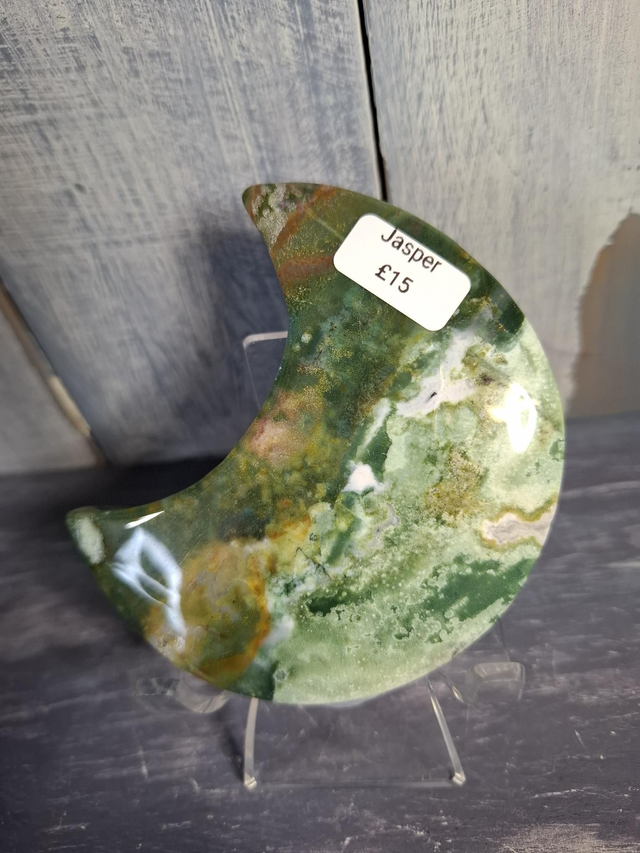 Colourful Jasper moon, measuring approx 83mm x 49mm. Jasper is an opaque variety of Quartz and comes in a large variety of patterns and colours, from simple Red and Yellow Jasper, to patterned Jaspers like Picasso and Picture Jasper. Rarer Jaspers such as Ocean Jasper and Orbicular Jasper can only be found in small, select locations. You will receive the exact crystal shown.