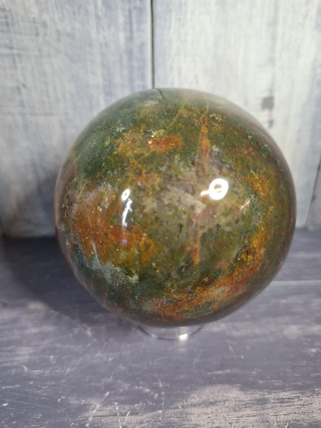 Colourful Jasper sphere, measuring approx 80mm. Jasper is an opaque variety of Quartz and comes in a large variety of patterns and colours, from simple Red and Yellow Jasper, to patterned Jaspers like Picasso and Picture Jasper. Rarer Jaspers such as Ocean Jasper and Orbicular Jasper can only be found in small, select locations. You will receive the exact crystal shown.