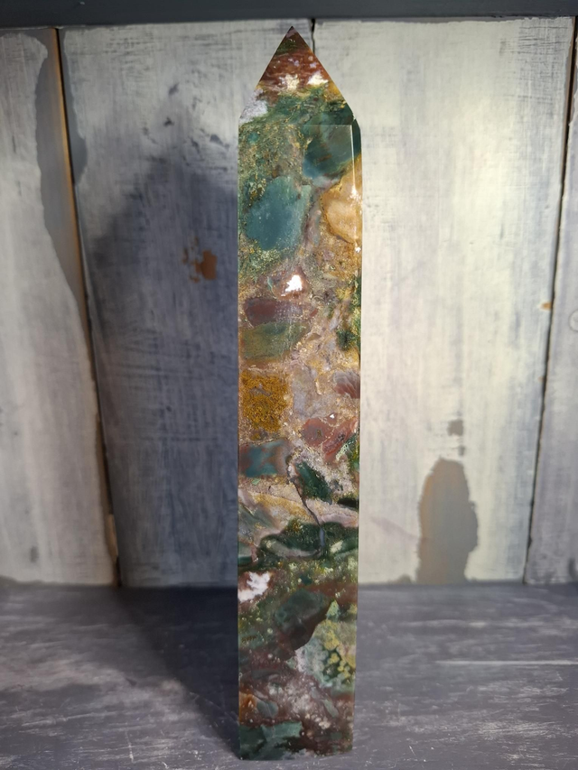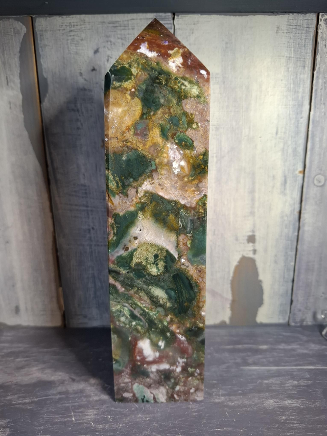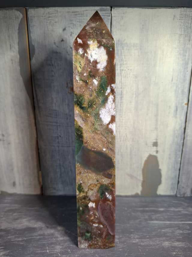 Colourful Jasper tower, with small druzy, measuring approx 199mm x 51mm x 34mm. Jasper is an opaque variety of Quartz and comes in a large variety of patterns and colours, from simple Red and Yellow Jasper, to patterned Jaspers like Picasso and Picture Jasper. Rarer Jaspers such as Ocean Jasper and Orbicular Jasper can only be found in small, select locations. You will receive the exact crystal shown.