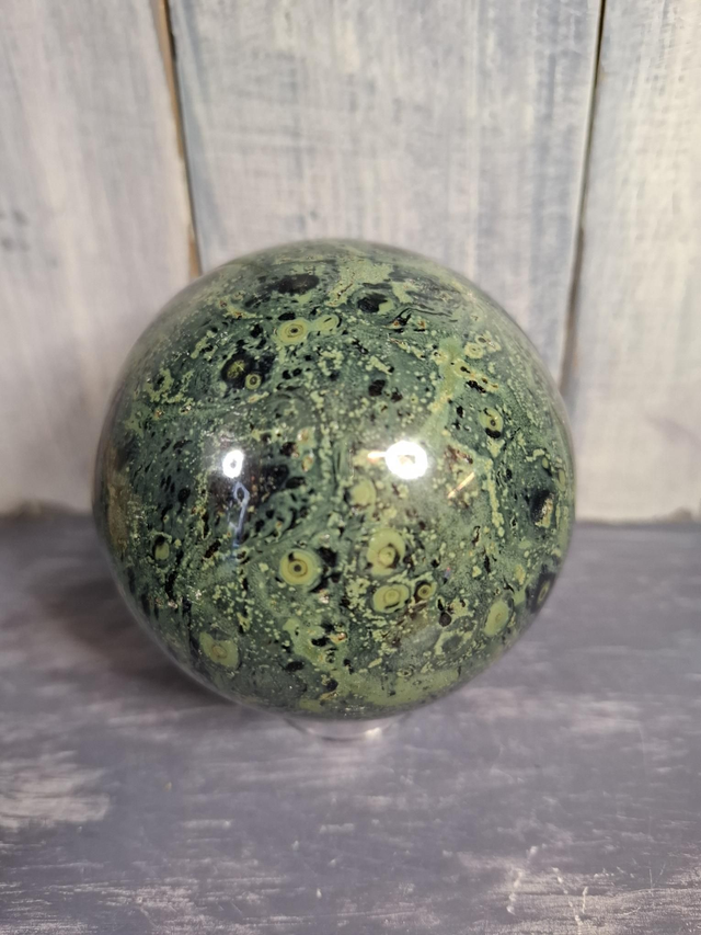 Kambaba sphere, measuring approx 79mm. Also known as Kambaba Jasper, although it is not a true Jasper but a volcanic Rhyolite from the coast between South Africa and Madagascar. You will receive the exact crystal shown.