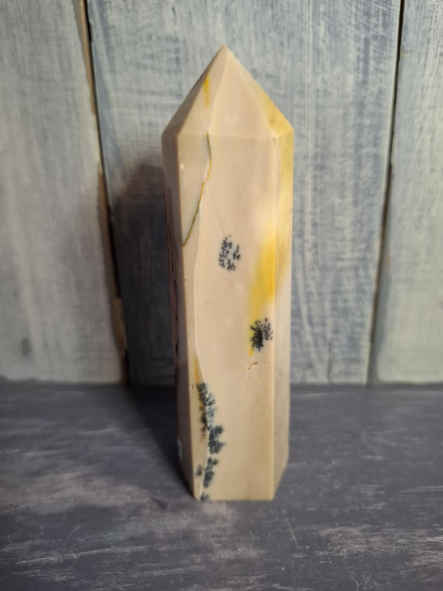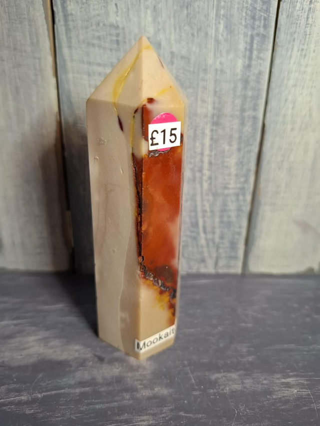 Red and cream Mookaite tower with dendrites, measuring approx 106mm x 26mm. Can only be found in Mooka Creek, Western Australia. Also known as Mookaite Jasper but is not a true Jasper, it has beautiful patterns and colours from reds, purples, yellows to creams and pinks. You will receive the exact crystal shown.