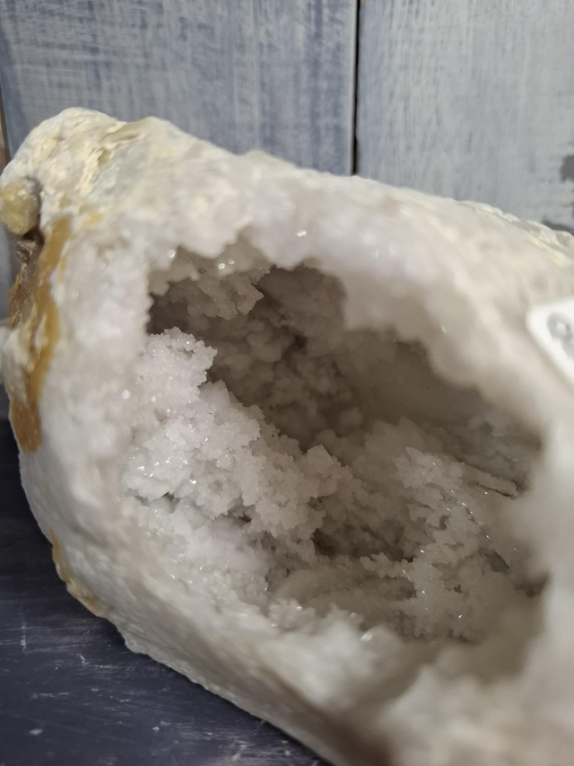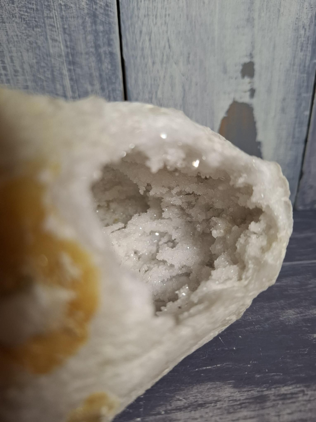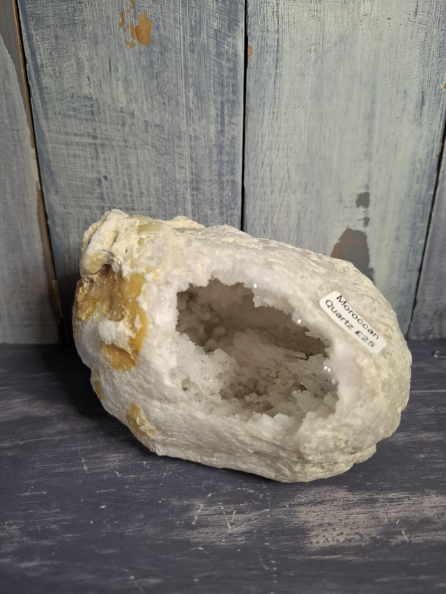 Moroccan Quartz geode, measuring approx 121mm x 85mm. Natural Quartz crystal geodes, mined in the Atlas Mountains and Saharan regions of Morocco. Known for their rough, brown exteriors that, when cracked open reveal beautiful, sparkly white or clear Quartz crystals inside. You will receive the exact crystal shown.
