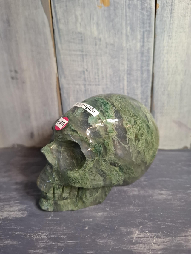 Moss Agate skull, measuring approx 94mm x 59mm. As Moss Agate is not banded it is not an agate but a Chalcedony, part of the Quartz family. The 'Moss' inclusions in the crystal are fern like dendrites of manganese or iron. You will receive the exact crystal shown.