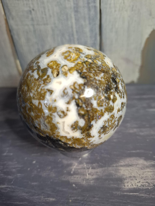 Moss Agate sphere, measuring approx 64mm. As Moss Agate is not banded it is not an agate but a Chalcedony, part of the Quartz family. The 'Moss' inclusions in the crystal are fern like dendrites of manganese or iron. You will receive the exact crystal shown.