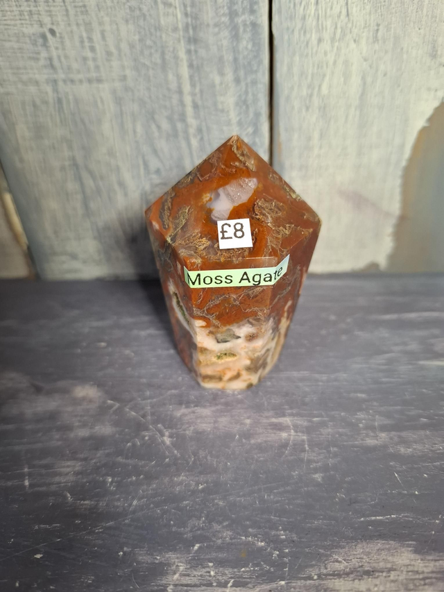Moss Agate tower, measuring approx 63mm x 38mm. As Moss Agate is not banded it is not an agate but a Chalcedony, part of the Quartz family. The 'Moss' inclusions in the crystal are fern like dendrites of manganese or iron. You will receive the exact crystal shown.