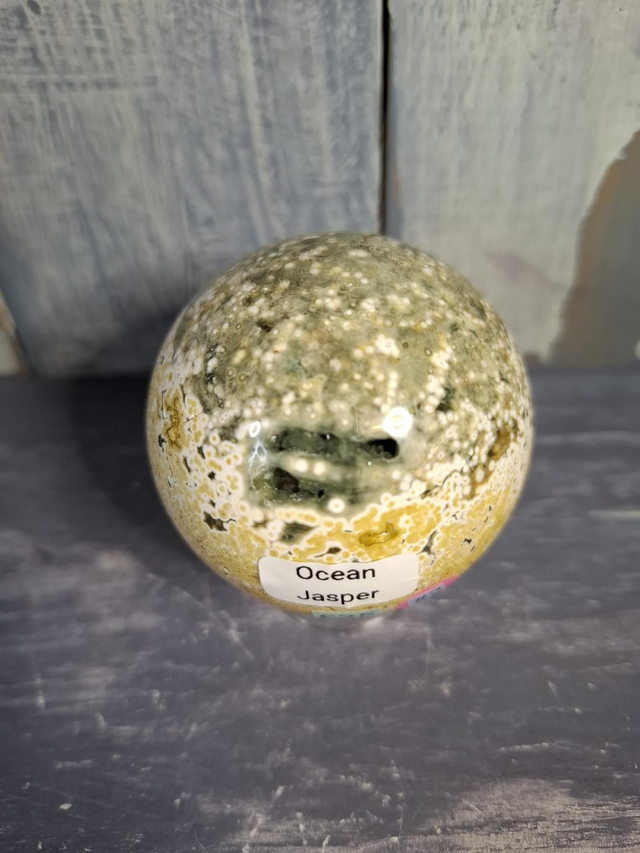 Ocean Jasper sphere with druzy, measuring approx 56mm. Ocean Jasper is a rare, multi-coloured variety of Orbicular Jasper, a type of Chalcedony/Quartz, known for its patterns and vibrant colours of greens, yellows, pinks and whites. It is found exclusively along the coast of Madagascar and mined during low tide. You will receive the exact crystal shown.
