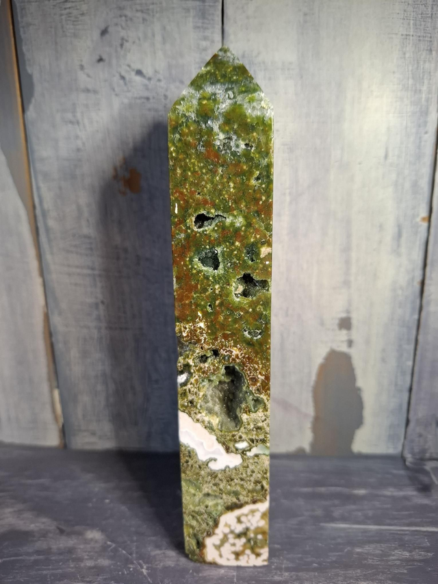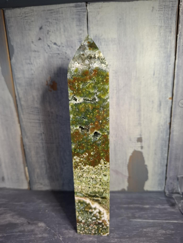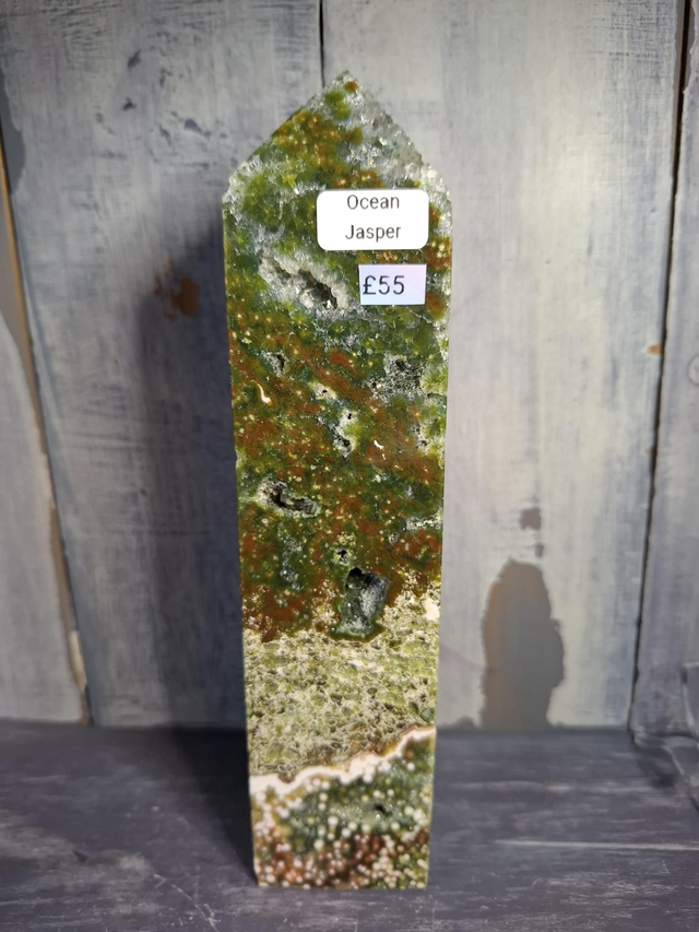 Ocean Jasper tower with lots of sparkling druzies, measuring approx 180mm x 43mm x 31mm. Ocean Jasper is a rare, multi-coloured variety of Orbicular Jasper, a type of Chalcedony/Quartz, known for its patterns and vibrant colours of greens, yellows, pinks and whites. It is found exclusively along the coast of Madagascar and mined during low tide. You will receive the exact crystal shown.