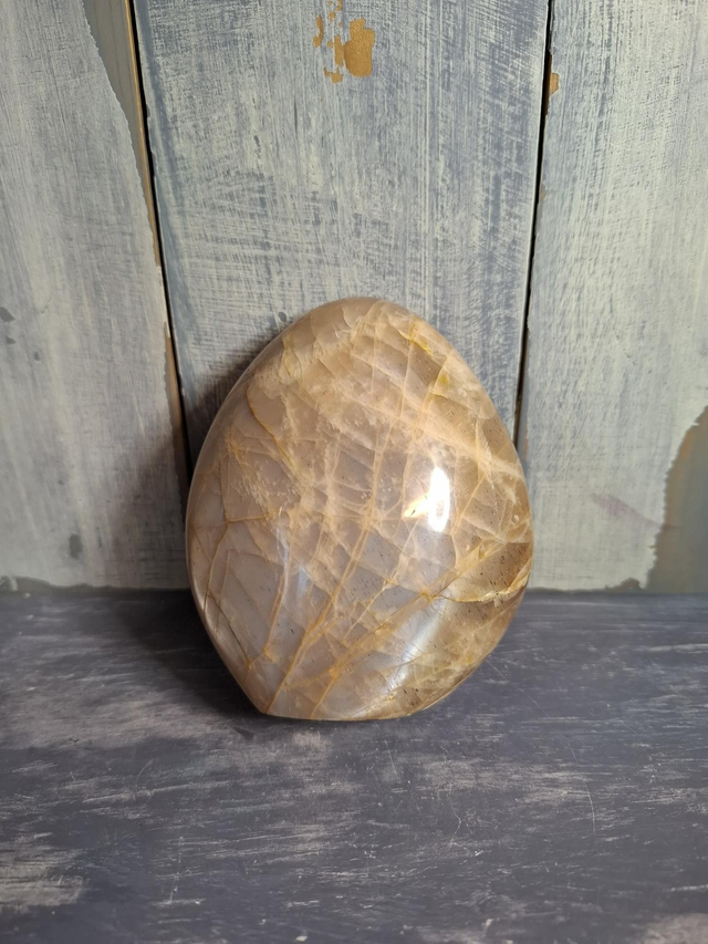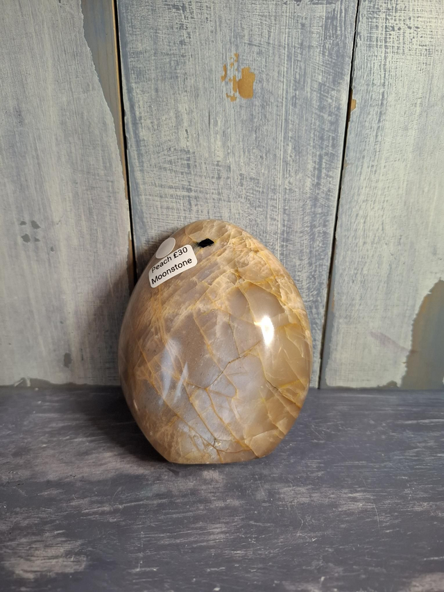 Peach Moonstone free-form with silver flash, measuring approx 92mm x 71mm. A Potassium Feldspar with a beautiful chatoyancy/shimmer when the crystal is moved about. Feldspar is a large group of minerals that includes Labradorite, Moonstone and Amazonite. You will receive the exact crystal shown.