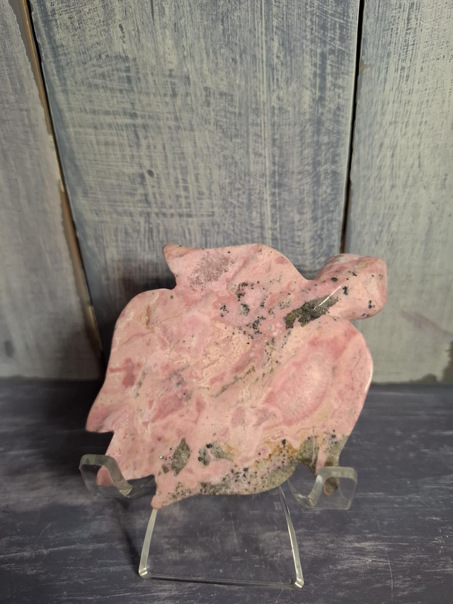 Soft pink Peruvian Rhodonite turtle, measuring approx 92mm x 72mm. Rhodonite gets its pink/red colour from Manganese and comes in a variety of shades of pink, quite often with black veins, and comes from Madagascar. More recently a brighter, bubblegum shade of pink Rhodonite has appeared on the market which comes from Peru. You will receive the exact crystal shown.