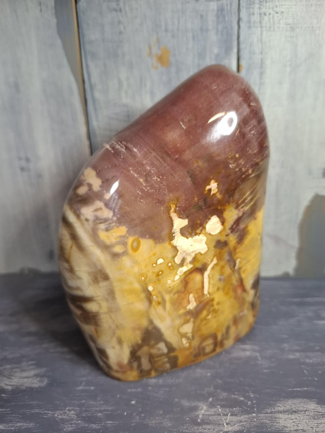 Petrified Wood free-form, measuring approx 128mm x 99mm, and weighing approx 1.1kg. A fossil which forms when a tree dies and the organic matter is gradually replaced by Quartz, and dates back hundreds of millions of years. The colours come from the different elements in the mud/water from when the wood was petrified. Found in many locations but most famously in the Petrified Forest in Arizona, USA. You will receive the exact crystal shown.
