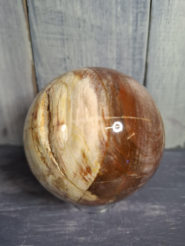Petrified Wood sphere, measuring approx 75mm. A fossil which forms when a tree dies and the organic matter is gradually replaced by Quartz, and dates back hundreds of millions of years. The colours come from the different elements in the mud/water from when the wood was petrified. Found in many locations but most famously in the Petrified Forest in Arizona, USA. You will receive the exact crystal shown.