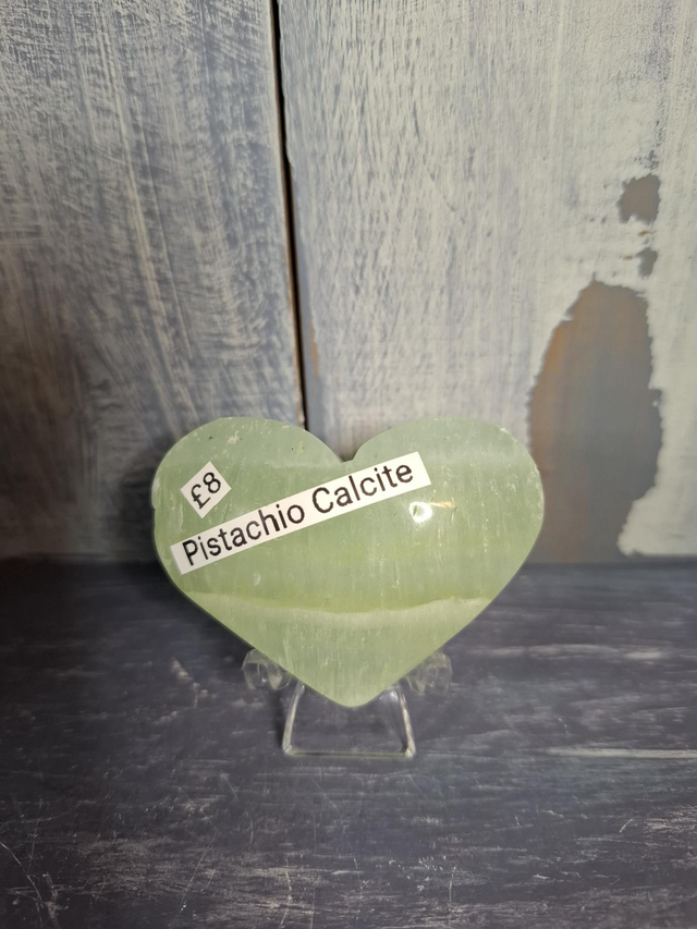 Pistachio Calcite heart, measuring approx 55mm x 41mm x 23mm. Found in soft shades of green, through to a deep green with blue hues. Newly discovered in Pakistan. Most banded Calcite is found in Pakistan or Mexico, often in shades of green, white and yellow. Calcite is found all over the world in a variety of colours and forms. Most common colours are Blue, Green, Yellow, Honey and Orange. Optical Calcite is a clear double refractive variety. Mangano Calcite, or Pink Calcite is a soft pink, that glows under uv light. You will receive the exact crystal shown.