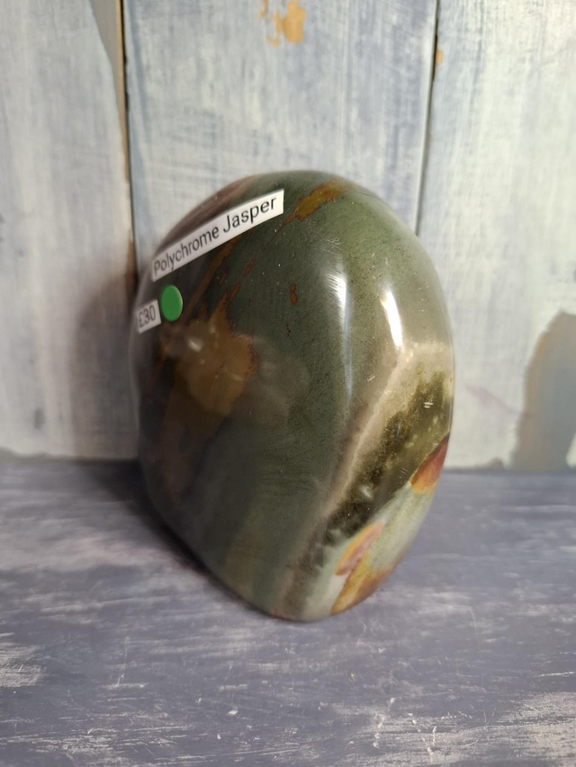 Polychrome Jasper free-form, measuring approx 100mm x 95mm. A fairly new discovery from Madagascar with attractive patterns. Jasper is an opaque variety of Quartz and comes in a large variety of patterns and colours. You will receive the exact crystal shown.
