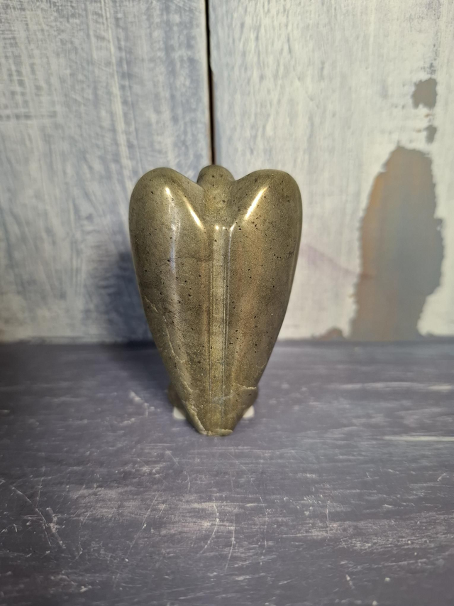 Pyrite angel, measuring approx 59mm x 36mm. Pyrite is also known as 'Fools Gold' and are found in crystal forms such as clusters called Chispas or flat crystal forms called Pyrite Suns or Dollars The golden cubes are most commonly found in Navajun, Spain. You will receive the exact crystal shown.