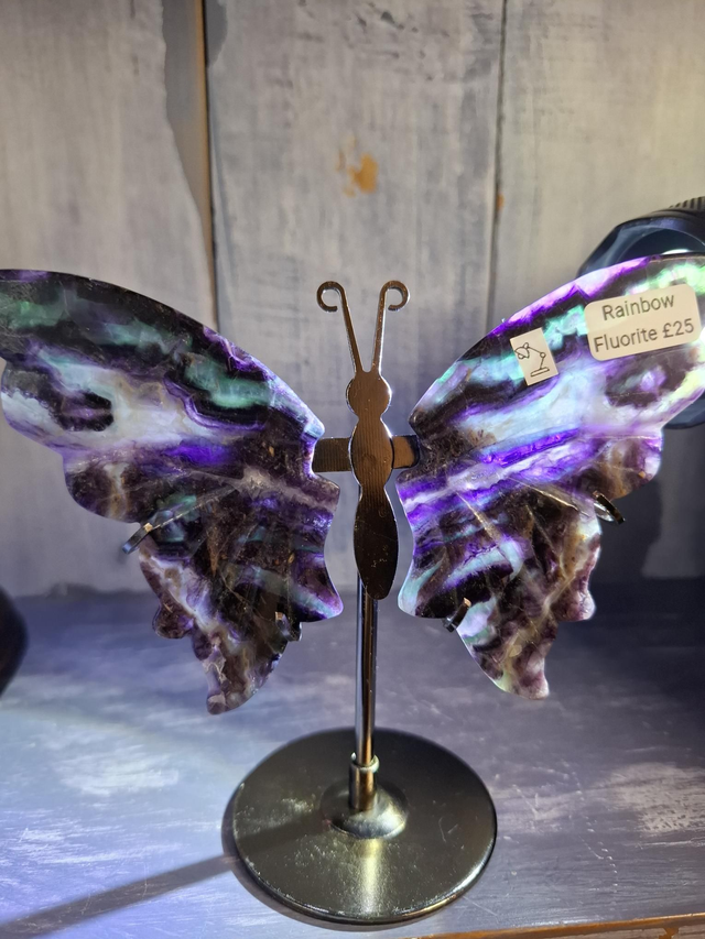 Rainbow Fluorite butterfly, each wing measuring approx 84mm x 63mm. Fluorite is found in a large variety of colours, due to the impurities in the crystal, and can be found in cubic form, octahedrons and large pieces without crystal structure visible to the naked eye. When Fluorite is pure it is colourless and many varieties are fluorescent. You will receive the exact crystal shown.